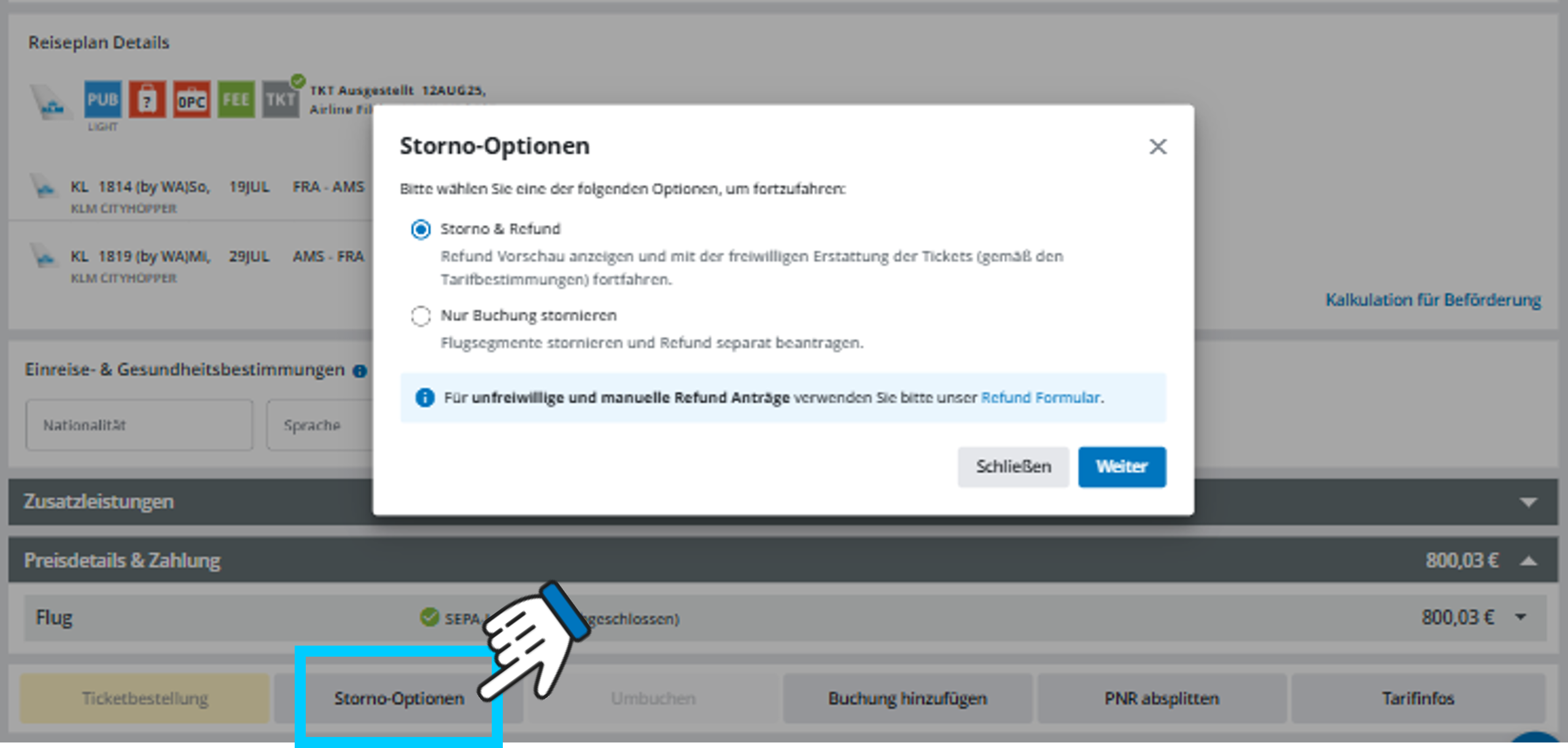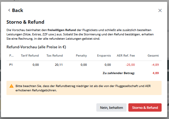 Wenn Sie „Storno & Refund“ auswählen, erhalten Sie eine Refund-Vorschau: