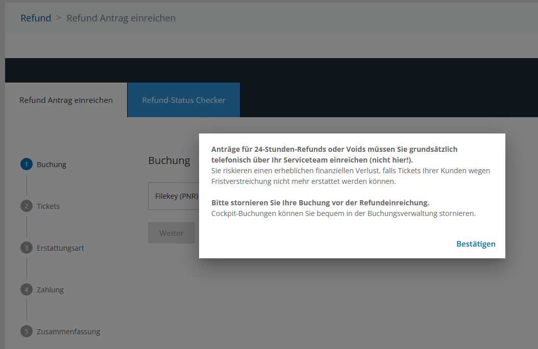 Es gibt zwei Möglichkeiten, dorthin zu gelangen. Entweder werden Sie zum Refundformular weitergeleitet, wenn weder eine Stornierung noch eine automatische Rückerstattung möglich ist (indem Sie versuchen, die Buchung zu stornieren), oder Sie navigieren direkt zum Refundformular.