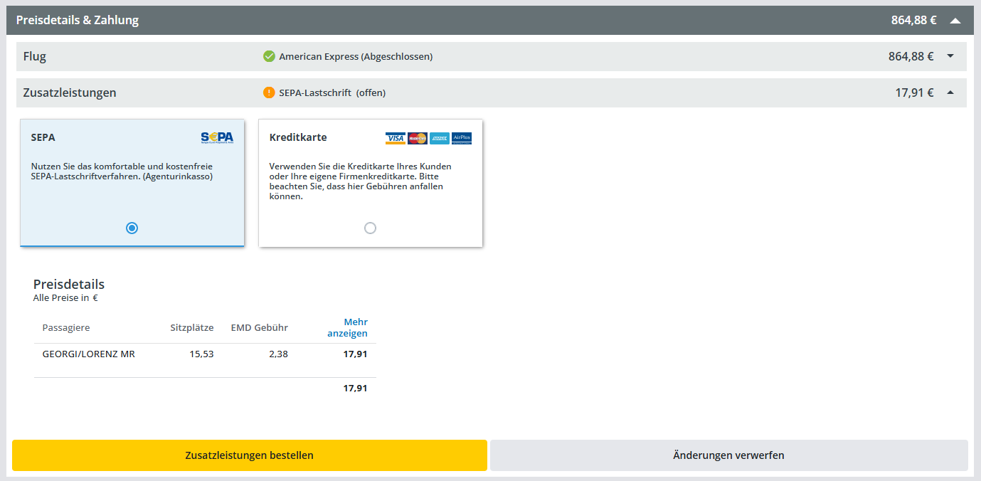 Jetzt können Sie die Buchung Ihrer Zusatzleistungen abschließen, indem Sie auf „Zusatzleistungen bestellen“ klicken, oder Sie können „Änderungen verwerfen“ wählen.