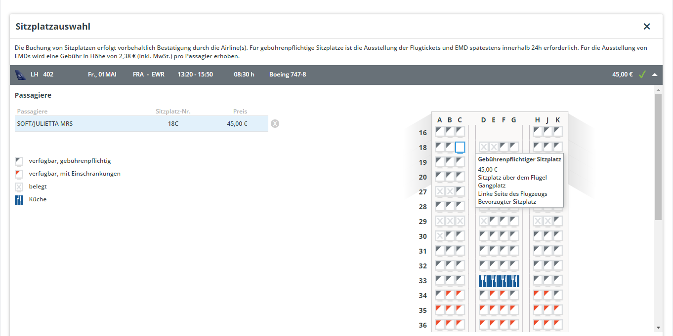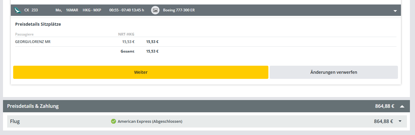 Sitzplätze und Extras können zu einem Einkauf zusammengefasst werden oder in separaten Einkäufen erfolgen, wenn sie zu unterschiedlichen Zeitpunkten getätigt werden.
