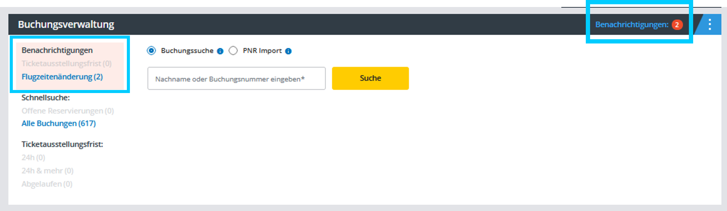 Unter „Meine Buchungen“ können Sie auf alle Buchungen mit Benachrichtigungen zu Flugzeitenänderungen oder TKTL-Warnungen zugreifen: