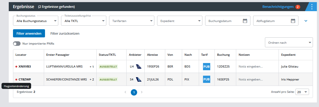 Wenn Sie auf den Link "Flugzeitenänderung" klicken, wird eine Liste aller Buchungen mit einer Benachrichtigung angezeigt: