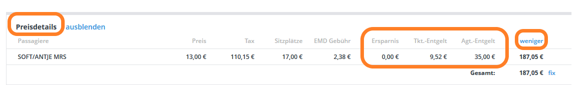 - EMD-Gebühren pro Person (Spalte wird nur angezeigt, wenn Sitzplätze oder Extras gebucht wurden)