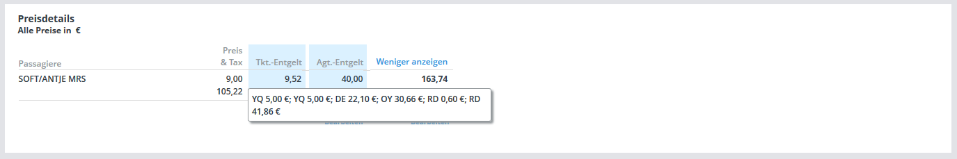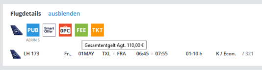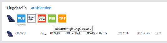 Eine Übersicht über die Höhe des aktuellen Entgeltes erhalten Sie jederzeit mittels Mouse-Over-Funktion beim FEE-Icon unter "Flugdetails":