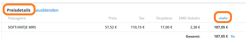 Nach Klick auf „mehr“ werden unter Preisdetails folgende zusätzliche Spalten angezeigt: