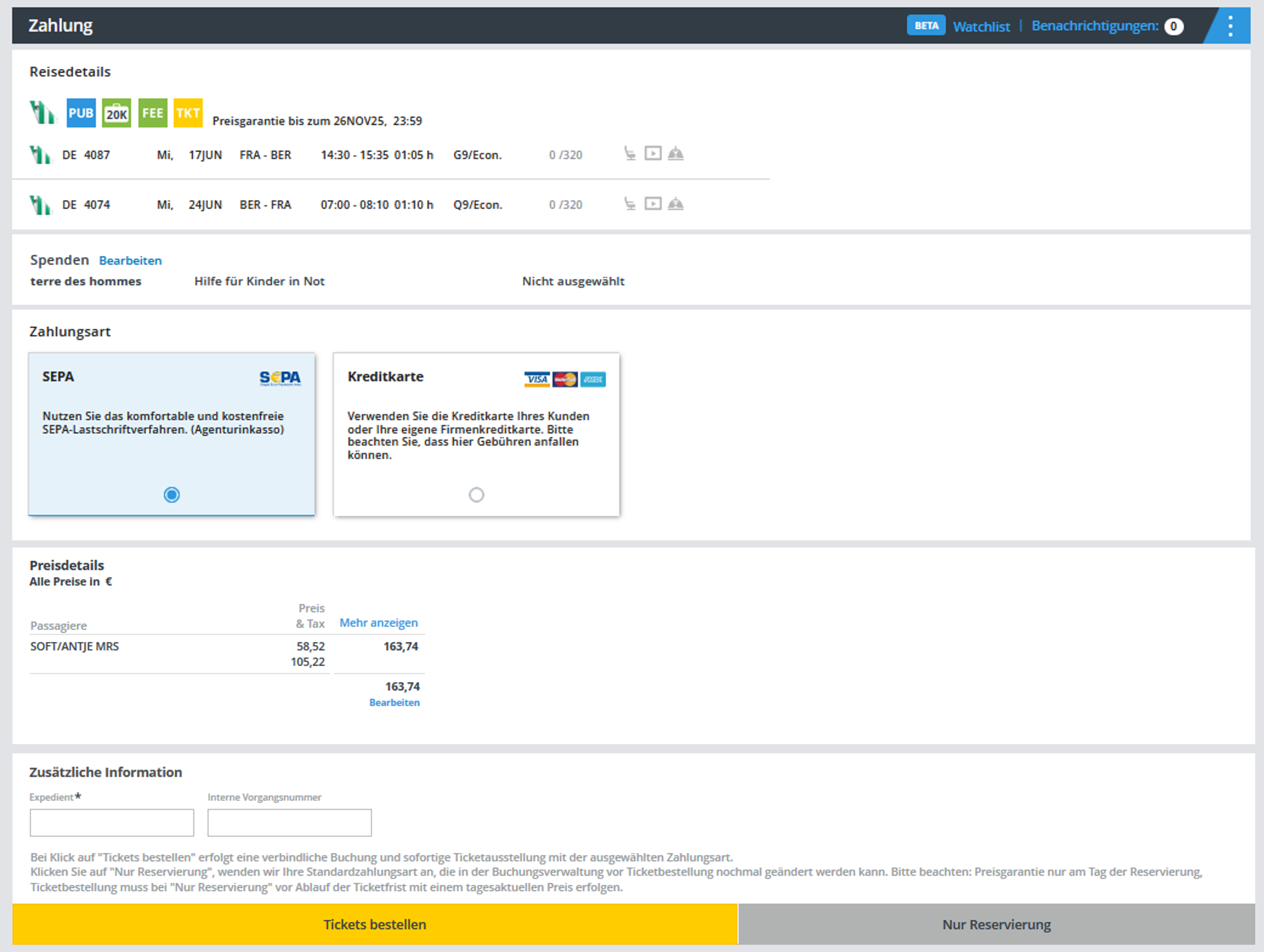- Serviceentgelt Airline pro Person (wird nur angezeigt, wenn ein Betrag über CC-Variante 2 bezahlt wird)