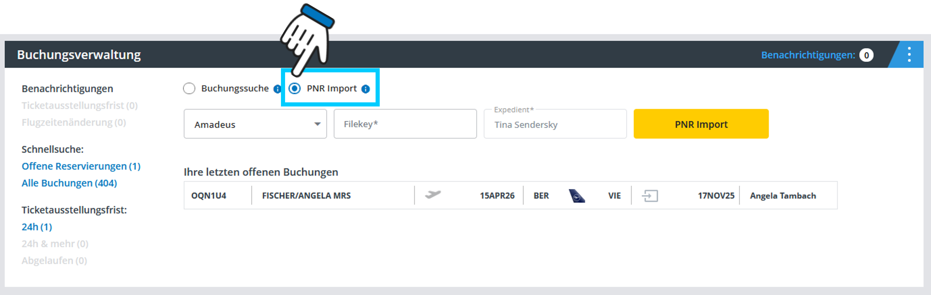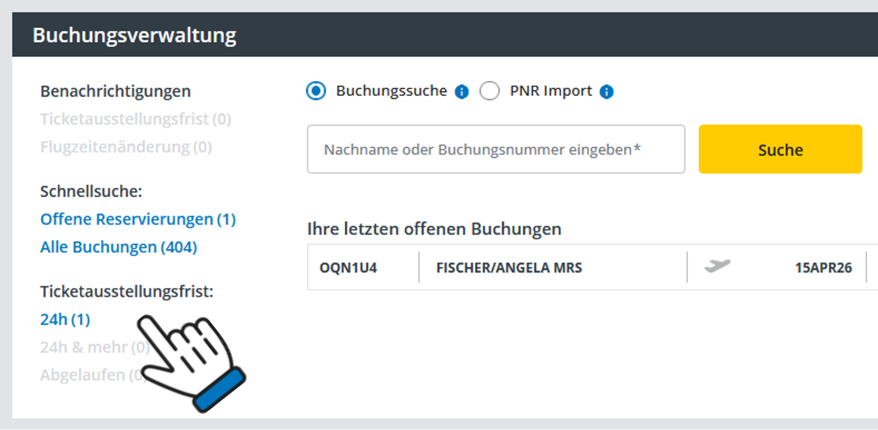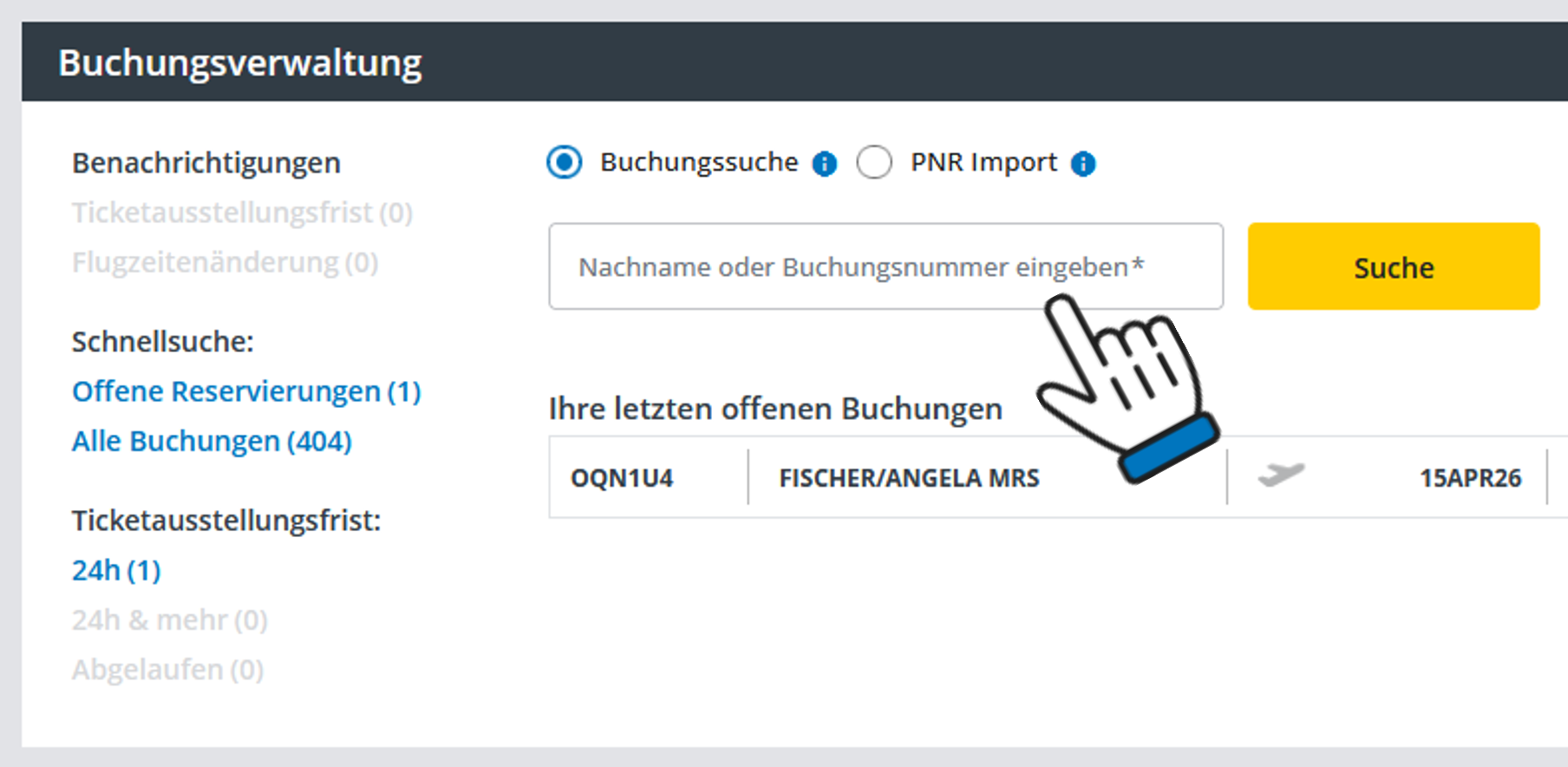 Wenn Sie einzelne Buchungen aufrufen und bearbeiten möchten, dann geben Sie bitte den Passagiernamen, Filekey oder Super PNR im Suchfeld ein.