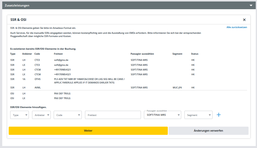 Die Pflichtelemente laufen im gebuchten GDS als SSR und dem dazugehörigen Code auf.