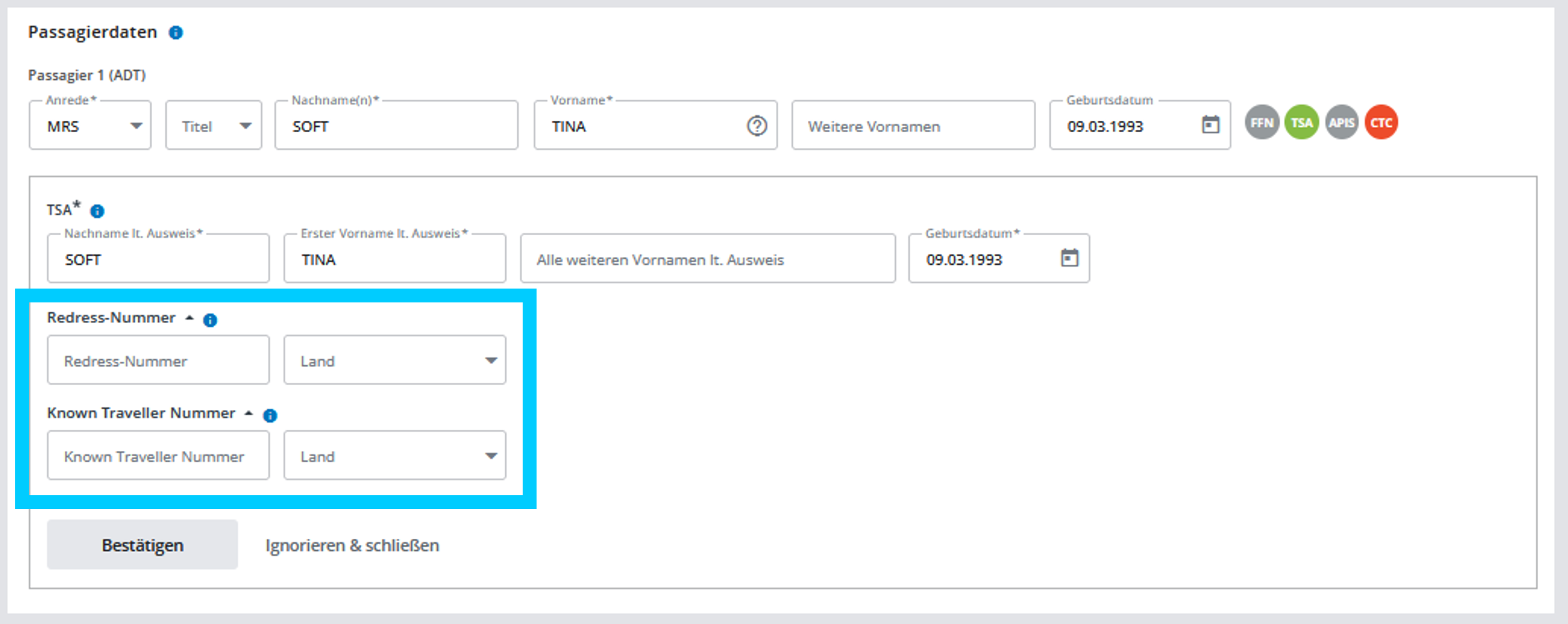 Vielfliegernummern (FFN), TSA- und APIS-Daten können sowohl während des Buchungsvorgangs als auch zu einer bestehenden Reservierung hinzugefügt werden. Durch Anklicken des entsprechenden Icons öffnen sich weitere Felder für die Eingabe dieser Daten. Außerdem können Sie auch die Redress oder Known Traveller Nummer hinterlegen.