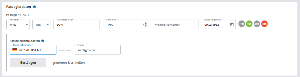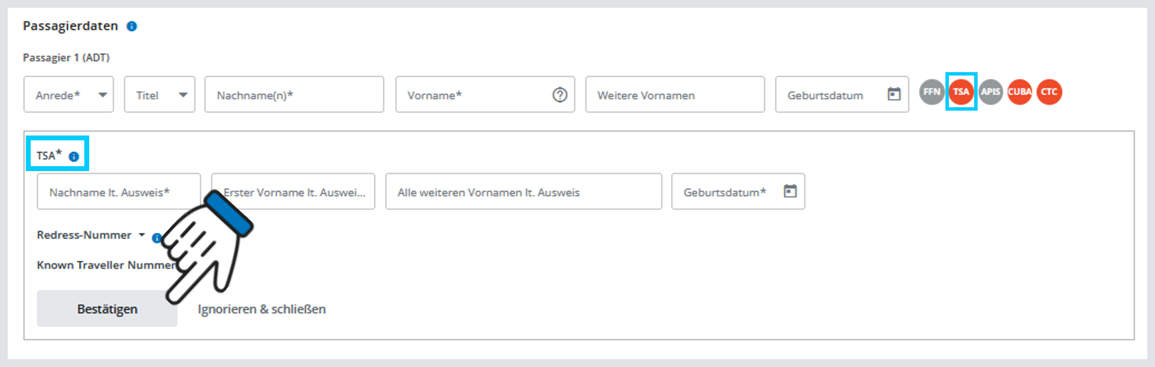 Unser System erinnert Sie daran, falls die Eingabe von TSA-Daten für die Ausstellung von Tickets erforderlich ist. In diesem Fall wird das rote TSA-Symbol in den Passagierdaten angezeigt. Wenn Sie auf dieses Symbol klicken, erscheinen zusätzliche Eingabefelder mit vorbelegten Informationen. Bitte ergänzen Sie die fehlenden Angaben und klicken Sie auf "Bestätigen".
