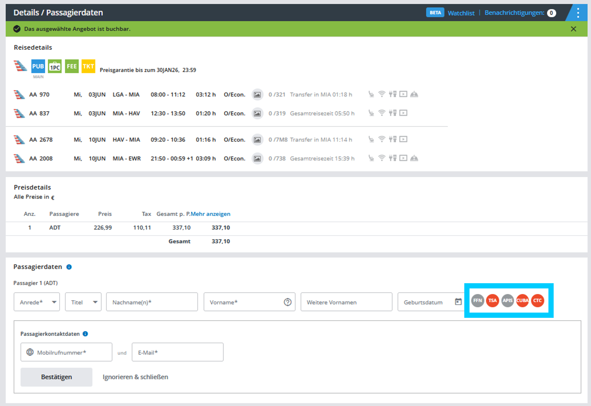 Hinweis: Das CUBA-Icon wird nur bei Reisen zwischen den USA und Kuba angezeigt. Hier ist eine Eingabe zum Zweck der Reise schon vor Buchungsabschluss erforderlich.