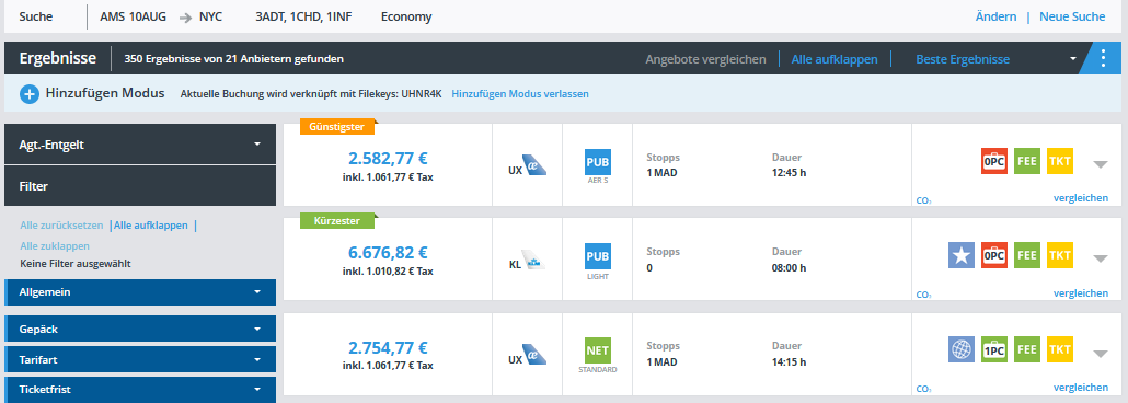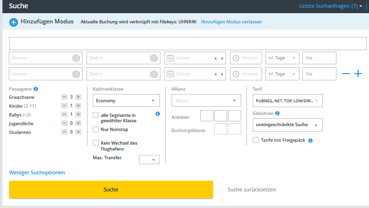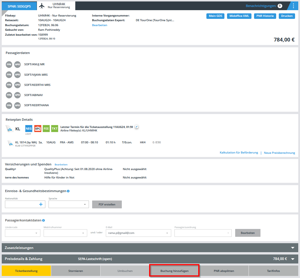 Indem Sie auf "Buchung hinzufügen" klicken, wird die Erstellung eines neuen dazu gehörigen PNR veranlasst: