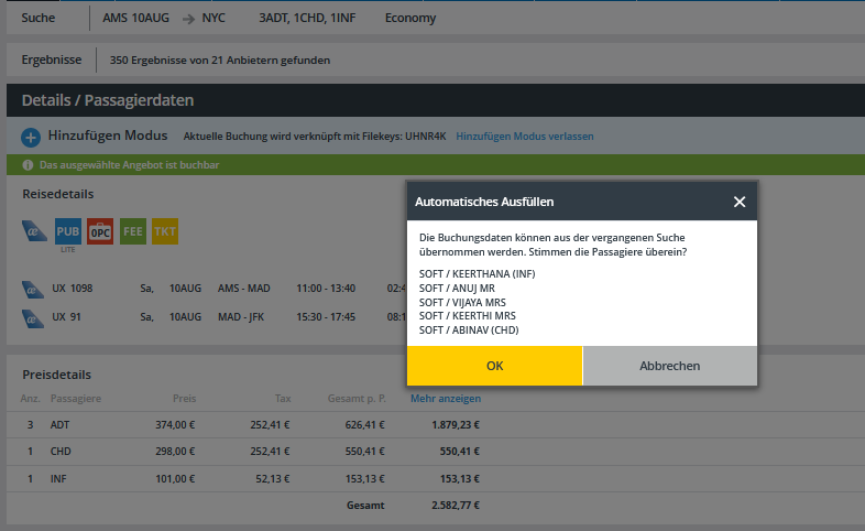 Mit Klick auf OK werden alle zu den genannten Passagieren verfügbaren persönlichen Daten auf die neue Buchung angewandt.