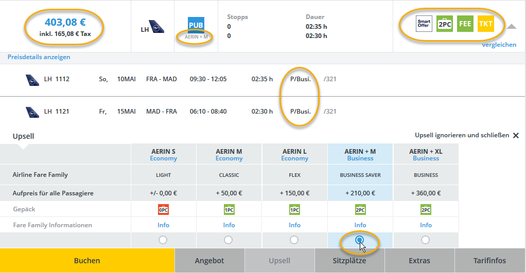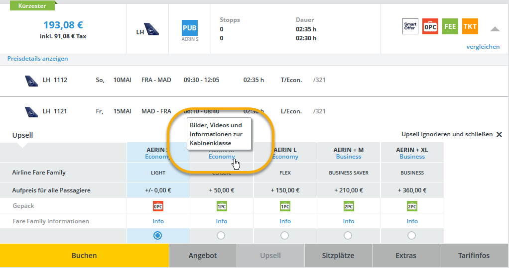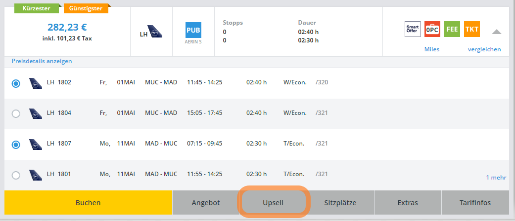 Nach Klick auf Upsell erhalten Sie Upsell-Angebote für die gewählten Flüge.