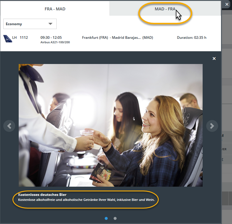Mittels Klick auf die Kabinenklasse öffnet sich ein Popup mit den entsprechenden dazugehörigen Bildern pro Flug.