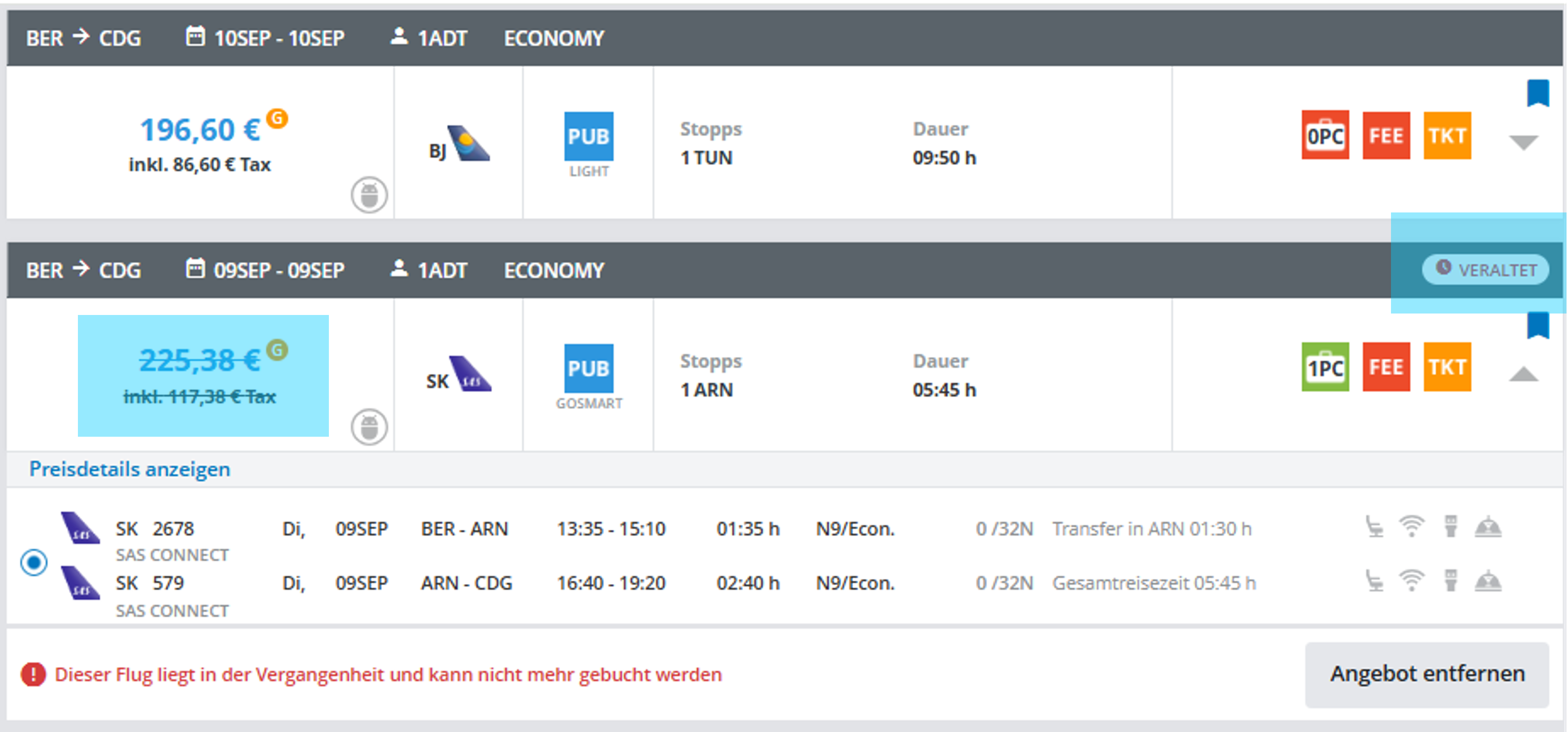 Angebote für Flüge in der Vergangenheit sind deutlich mit durchgestrichenem Preis und einem Warnhinweis gekennzeichnet.