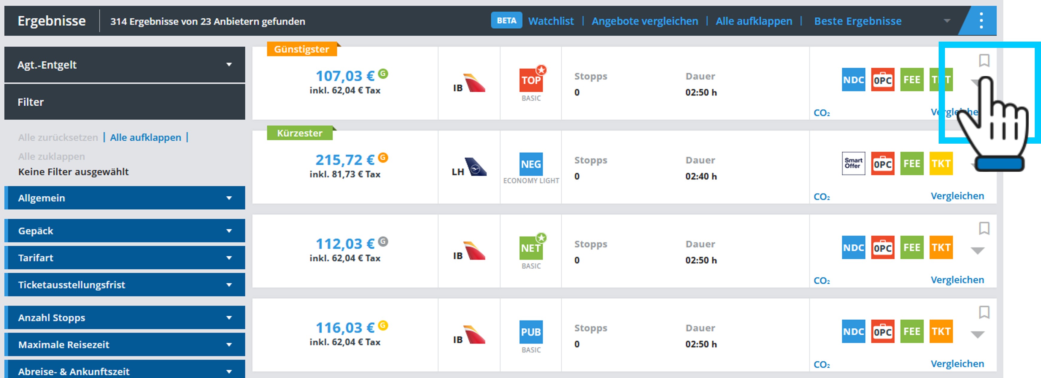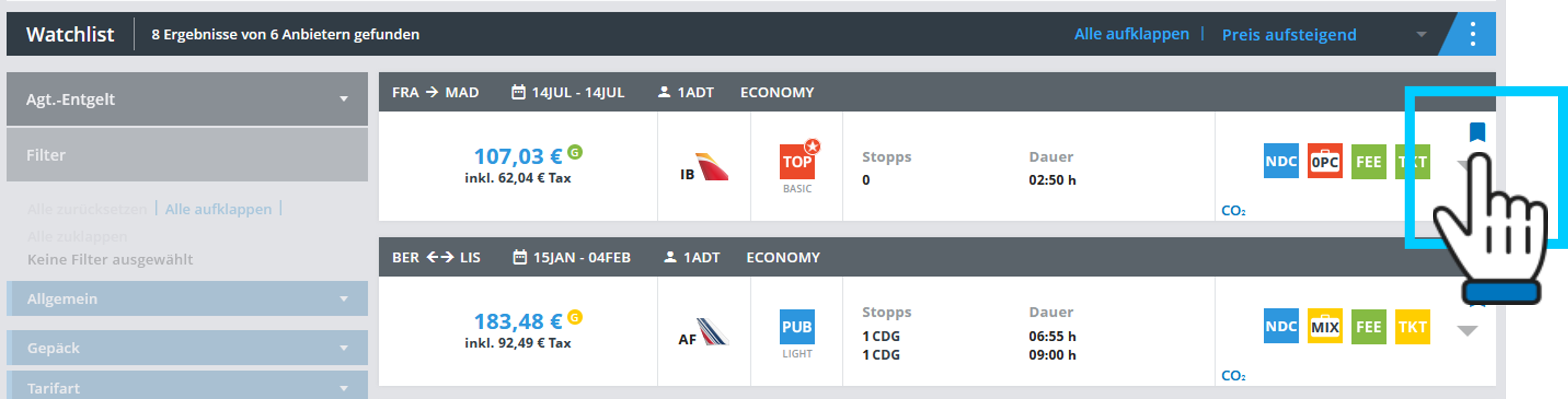 Die Funktion Watchlist soll Ihnen dabei helfen, Flugangebote effizient nachzuverfolgen und zu verwalten.
