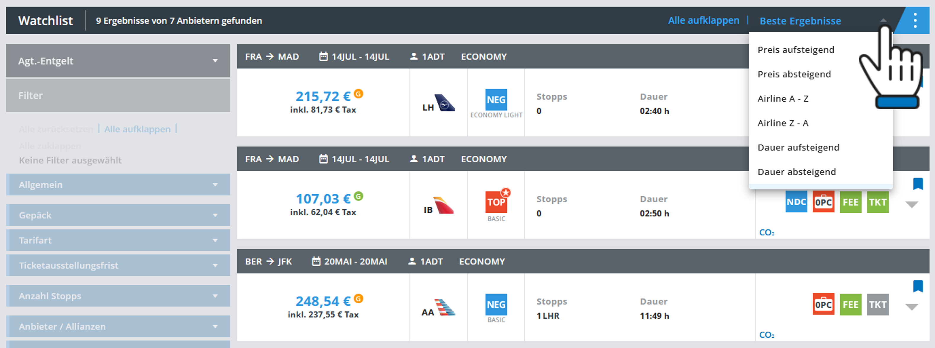 Sortieren Sie Ihre Watchlist nach Preis, Fluggesellschaft, Flugdauer oder besten Ergebnissen, um die Alternativen leichter vergleichen und finden zu können.