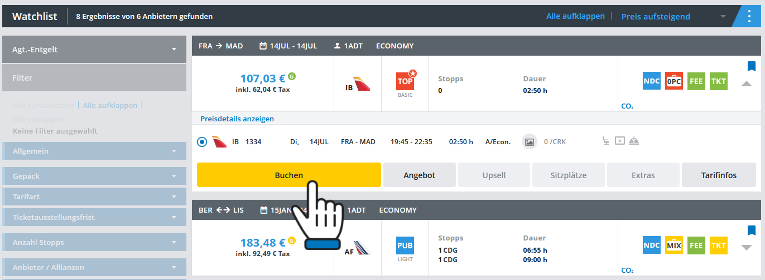 Jedes Angebot in der Watchlist ermöglicht nützliche Aktionen wie „Buchen“, „Angebot“, „Sitzplätze“, „Extras“ und „Tarifinfos“.