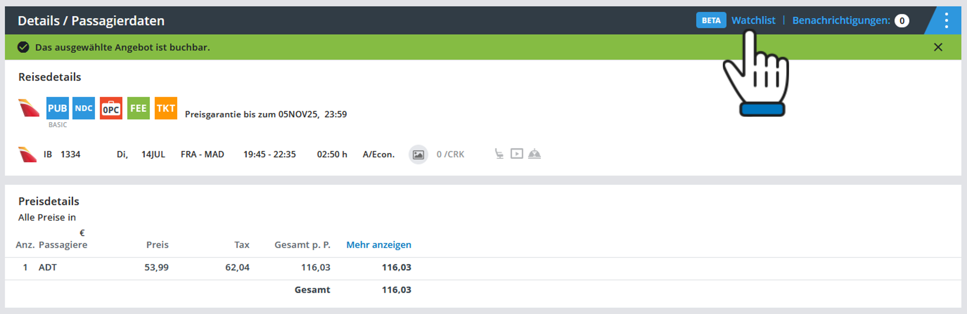 Greifen Sie auf alle gespeicherten Angebote auf der eigens dafür vorgesehenen Watchlist zu, die in allen Buchungsschritten erreichbar ist.