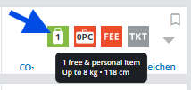 Wenn Sie bei „0PC“ mit der Maus über das Icon gehen, erhalten Sie in manchen Fällen die Information, was das erste Gepäckstück pro Person kosten würde. Bitte beachten Sie, dass dies nicht von allen Airlines / GDS unterstützt wird.
