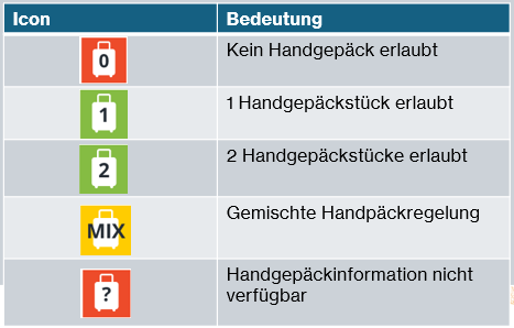 Das Symbol für Handgepäck zeigt Ihnen auf den ersten Blick, welches Gepäck Sie mit an Bord nehmen dürfen, einschließlich Größe und Gewicht, indem Sie mit der Maus über das Icon fahren.