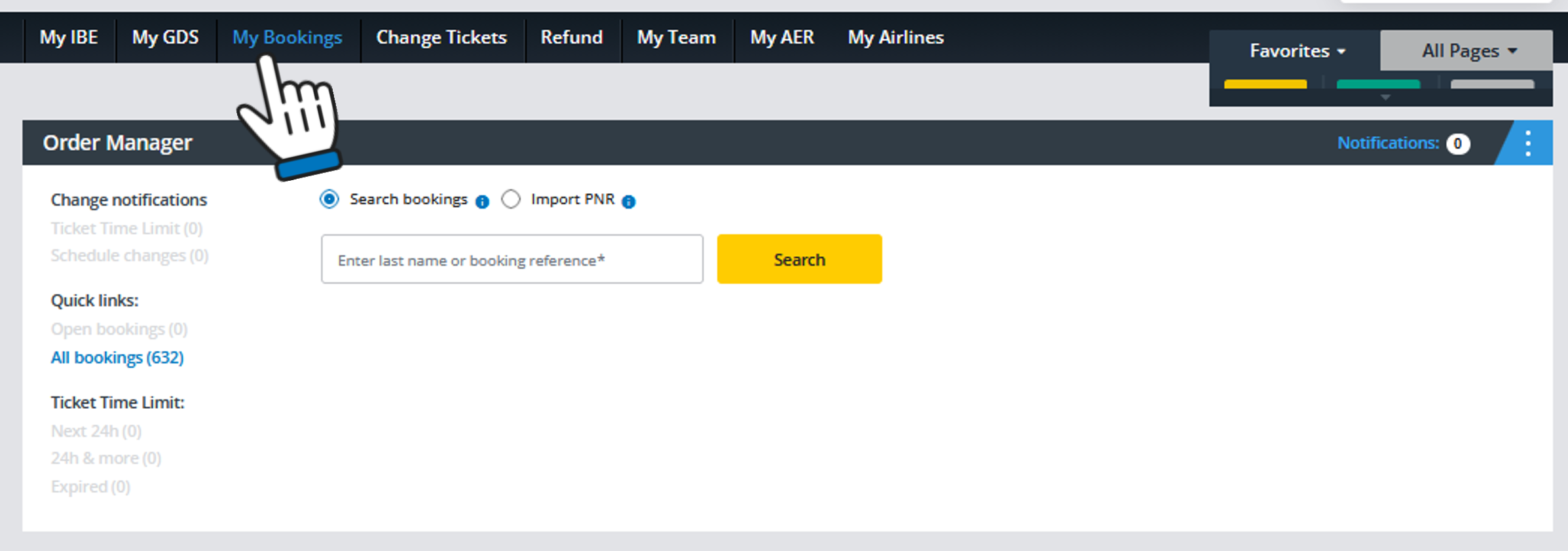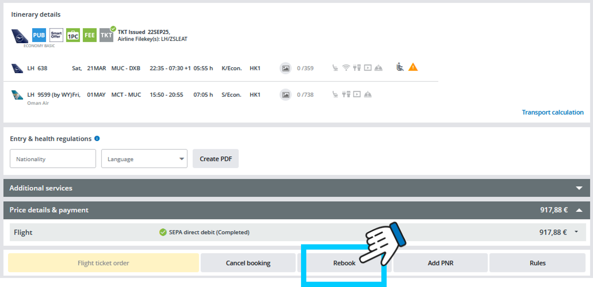 Retrieve the PNR in the Cockpit Order Manager ("My Bookings"):