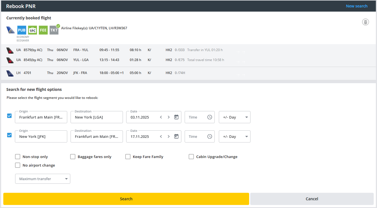 Select the flight segments to be rebooked and change the origin, destination or travel date (or all). Optionally choose a departure time and date flexibility if posible and/or select one of the filters to restrict the search and click on “Search”: