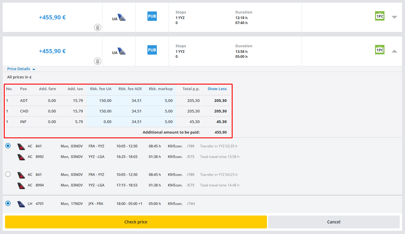 Select an offer from the list. You may display the price calculation by expanding the "Price Details". Only additional amounts to be paid are shown: