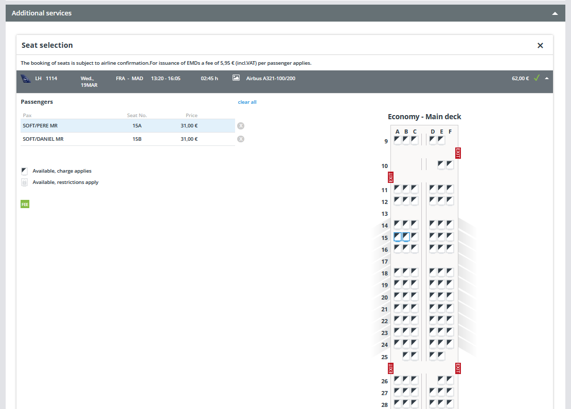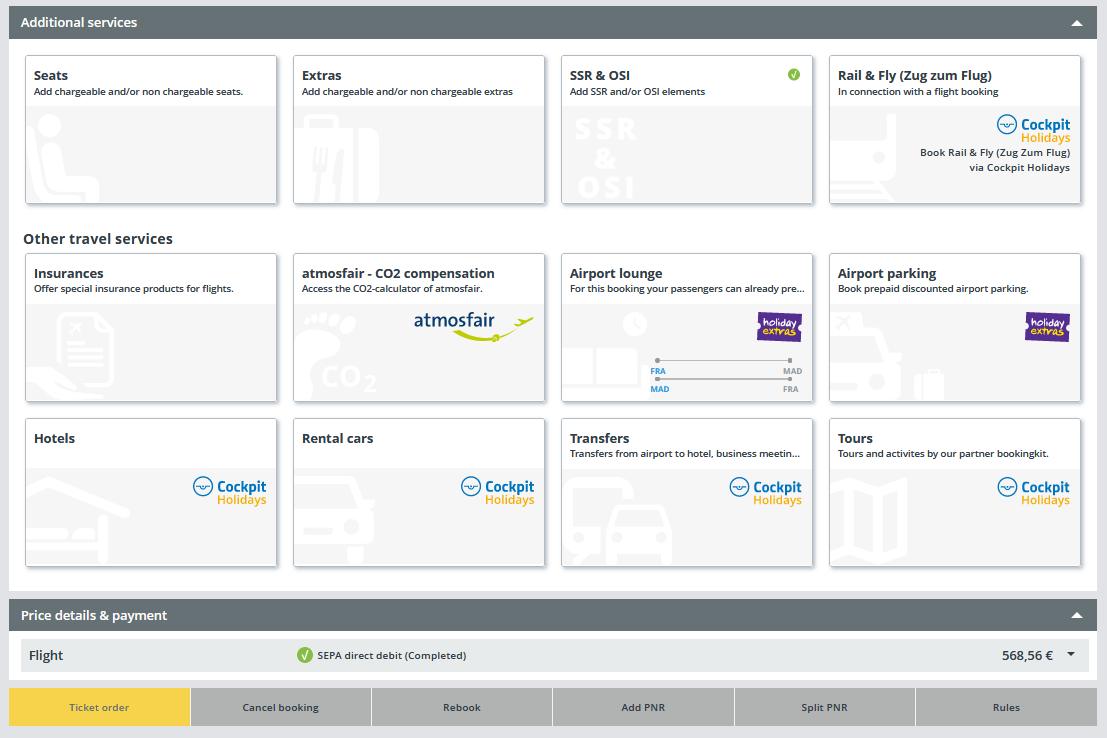 By clicking e.g. on the “seats” tile the seat map will be opened and you can select the seats: