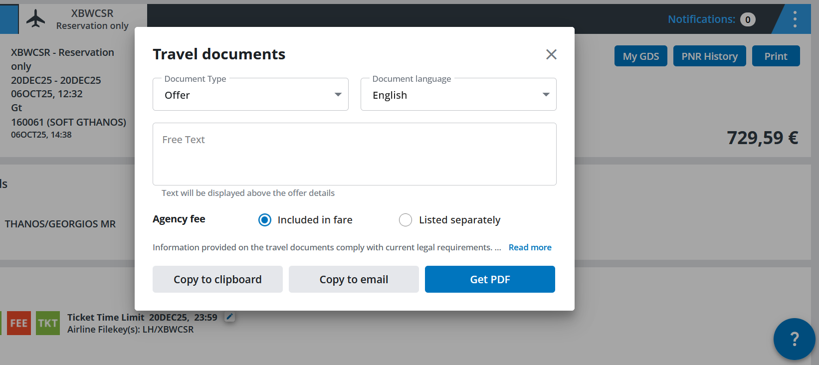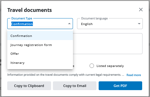 You can generate a confirmation, a journey registration form, an offer or an itinerary as a PDF file. These documents can be saved and printed or copied to clipboard or directly into an email as required.