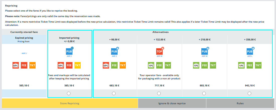 If the stored fare from import differs from the ones found by Cockpit, then the “Imported pricing” will be offered additionally to the fares found by Cockpit as an alternative.