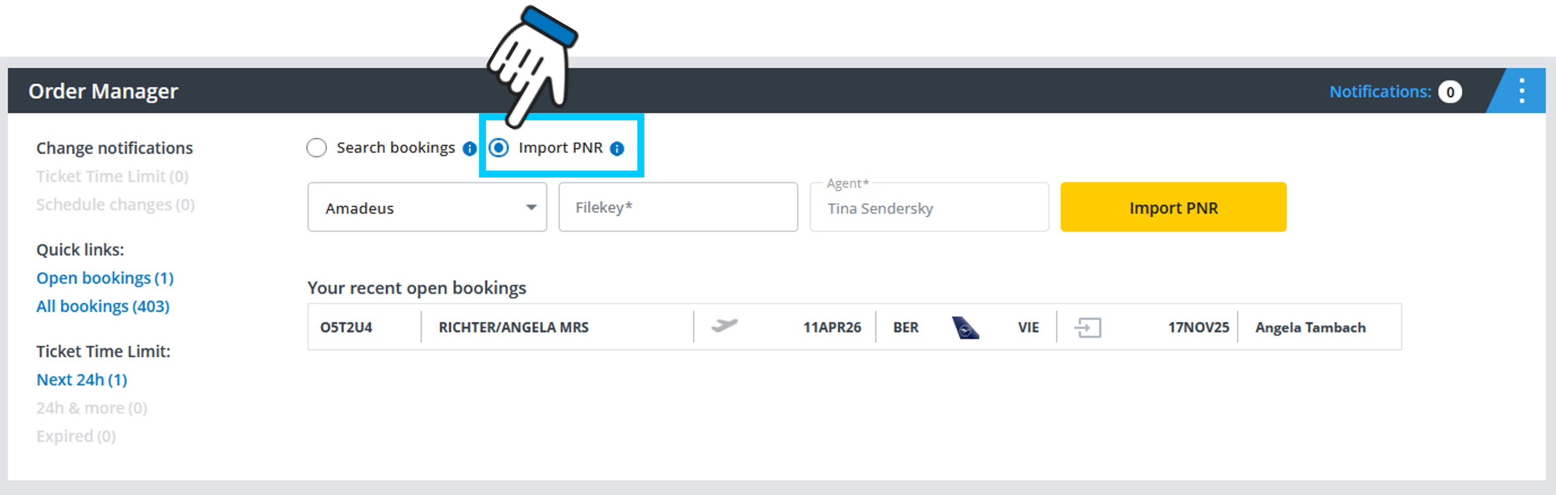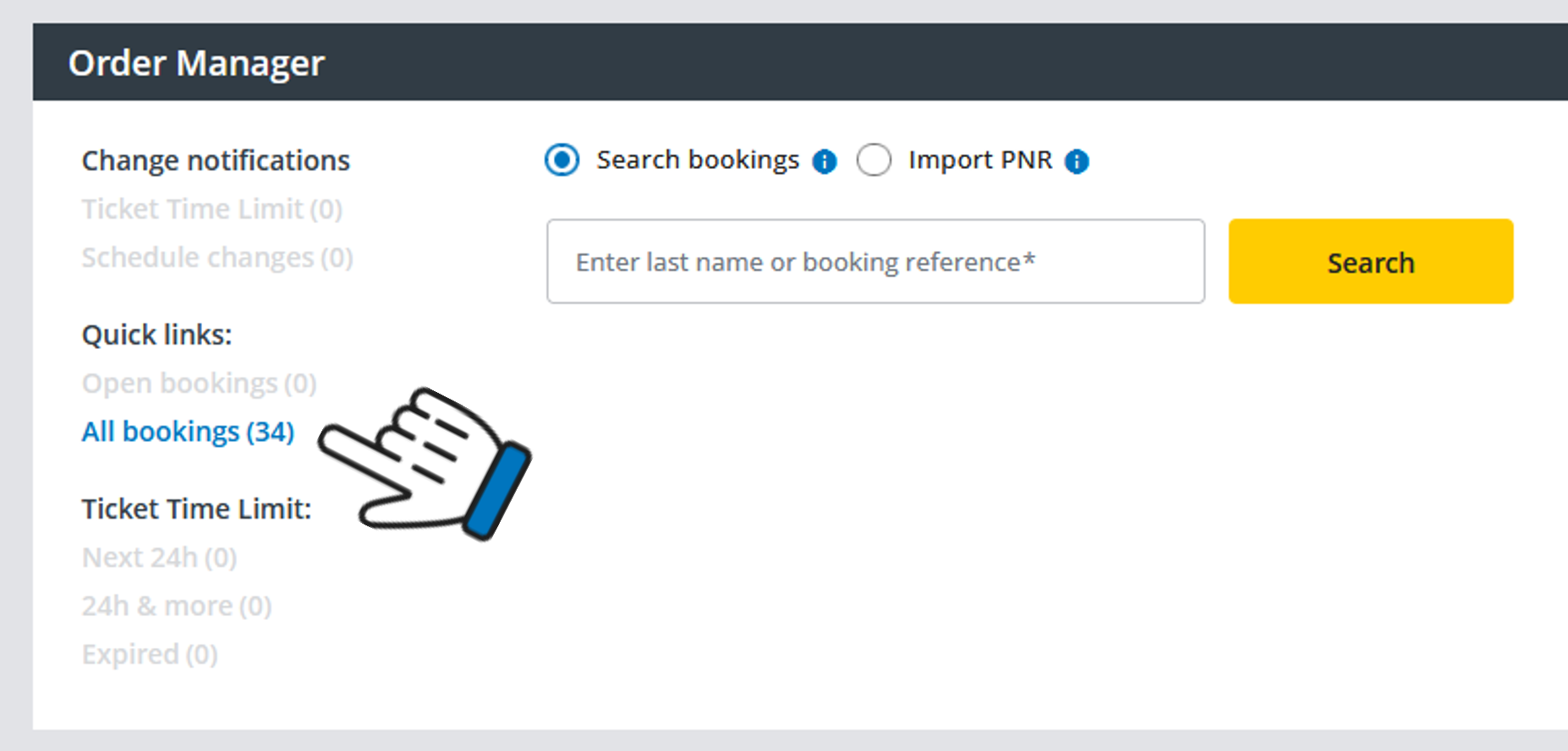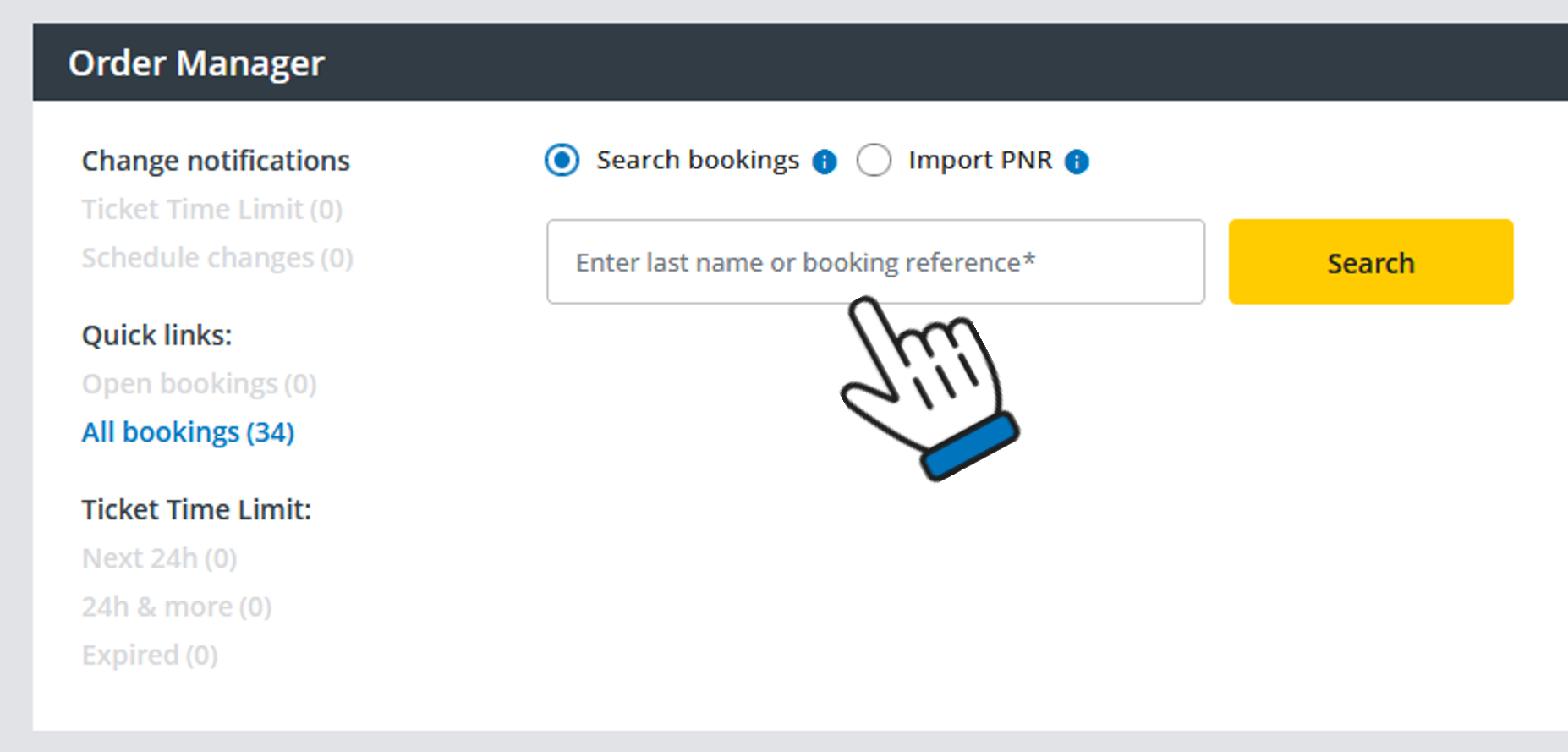 If you want to retrieve and edit individual bookings, please enter the passenger name, file key, or Super PNR in the search field of the Order Manager.