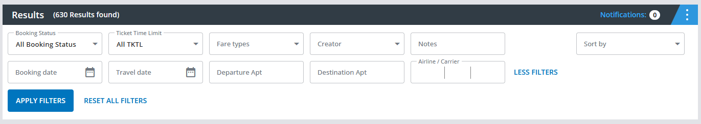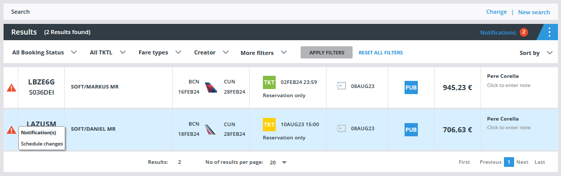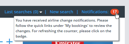 As soon as a notification of a flight schedule change or a new ticketing deadline (TKTL change) is available for a PNR, it is displayed in the notification counter: