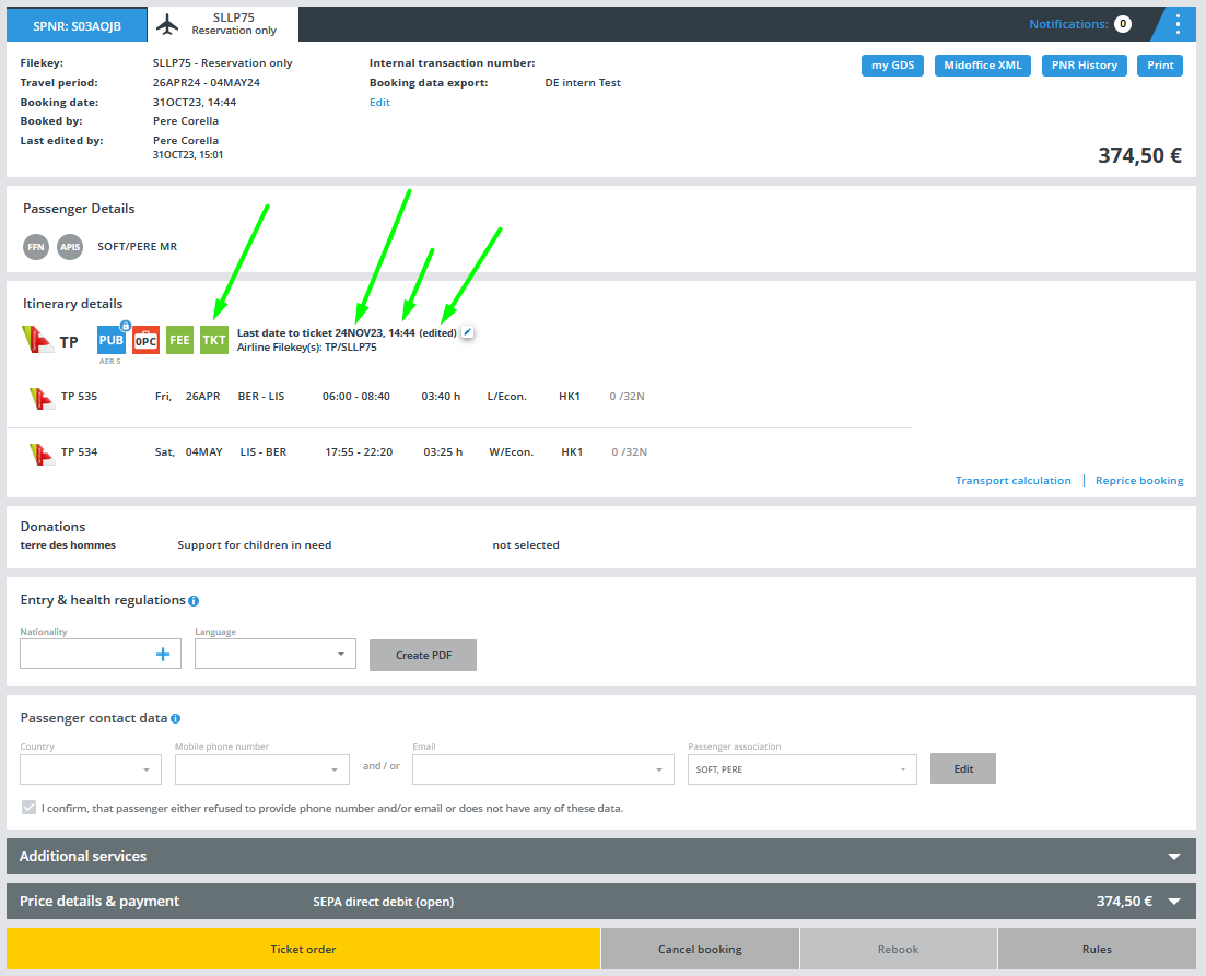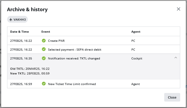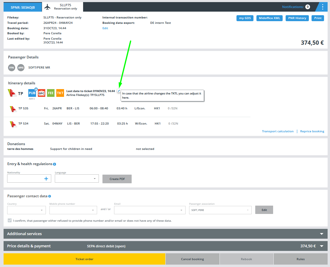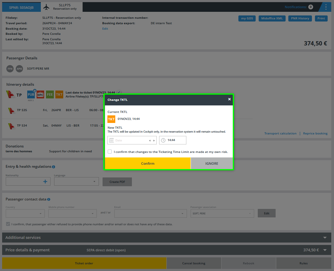 Cockpit displays the ticketing time limit (TKTL) as the “last date to ticket”. If you wish to enter a different TKTL for the booking (reservation only), this is possible at your own risk. All manual changes to the TKTL are stored in the booking history in Cockpit.