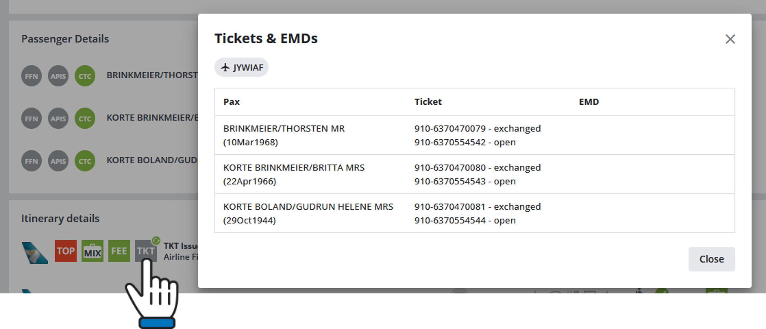 By clicking on the TKT icon, you will find not only the ticket numbers, but also the issued or voided EMDs.