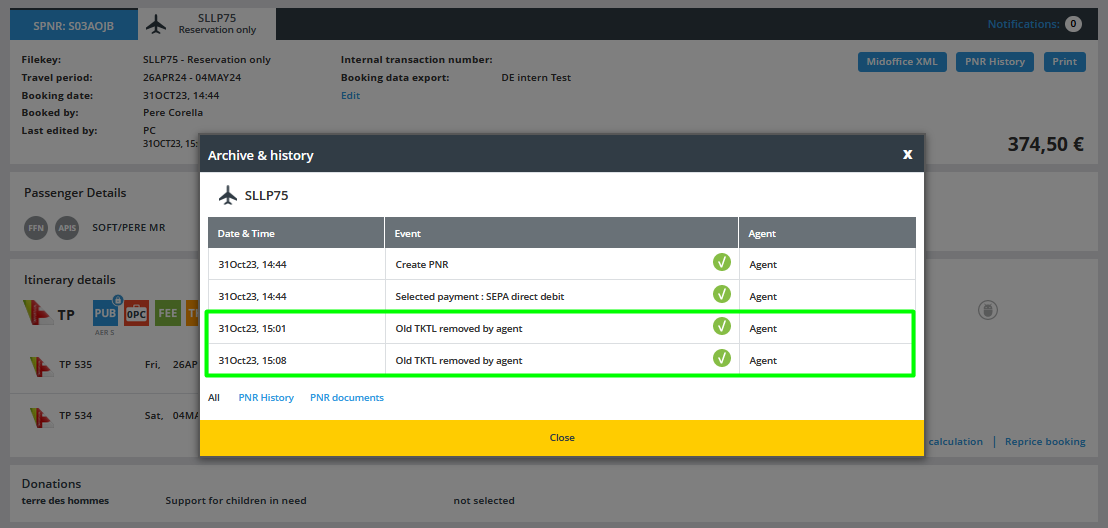 Each time a TKTL is edited manually, a new entry is created in the booking history: