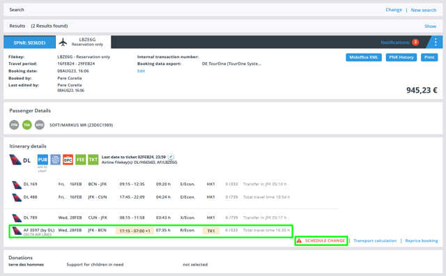 After opening the booking by clicking on it, the flight segments with a schedule change will be highlighted and the “SCHEDULE CHANGE” link will be displayed: