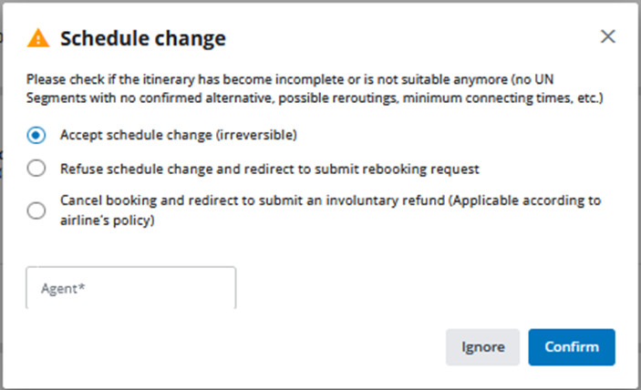 When you click on “SCHEDULE CHANGE” a pop-up window will open where you can accept the schedule change, reject it and request a rebooking, or cancel the booking and request an involuntary refund.