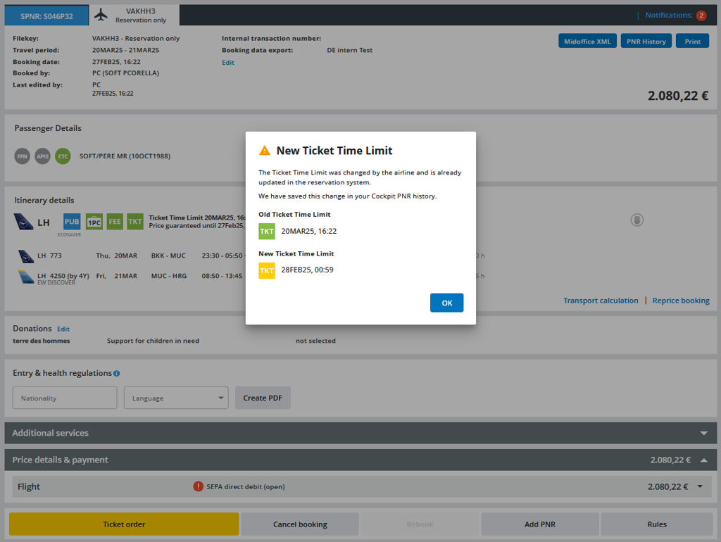 If the booking contains a warning regarding the time limit for issuing tickets, the new ticket time limit will be displayed in a pop-up which has to be confirmed by clicking on OK: