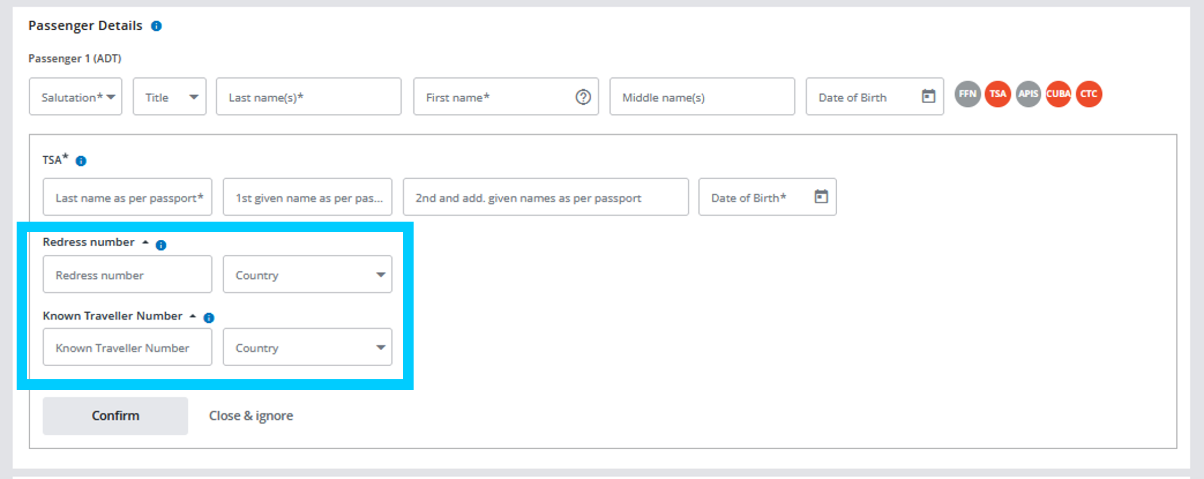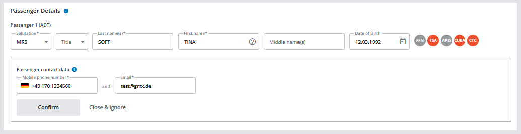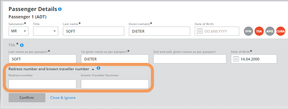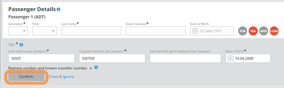 Our system will remind you in case TSA-data is mandatory for ticketing. In this case the TSA icon will be highlighted in red in the passenger details section. By clicking on the icon, additional entry fields with pre-populated information will appear. Please complete missing information and click on “Confirm”.