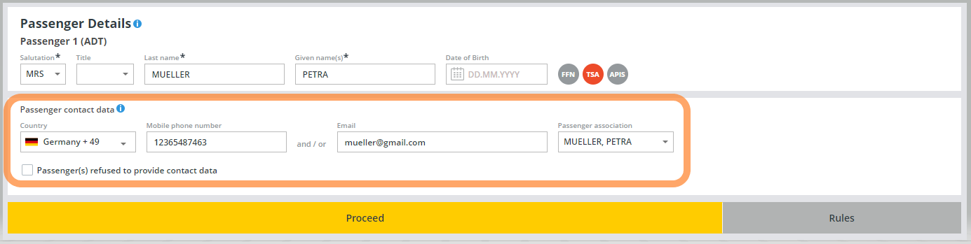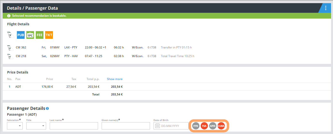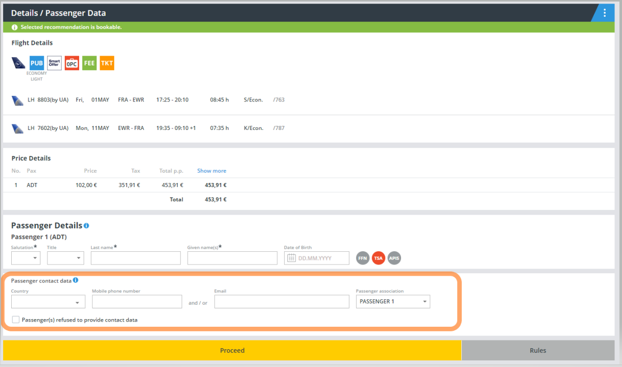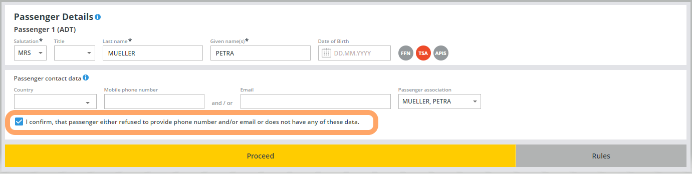 Note: TSA data is not mandatory for booking, but must be provided when ordering tickets. It can also be entered in the PNR later under “My bookings.”