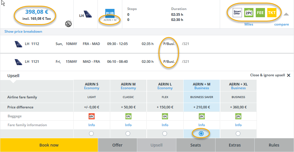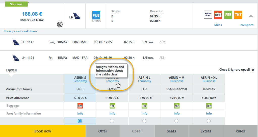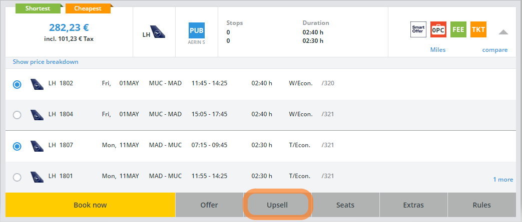 Clicking on the “Upsell” button shows you the pricing for available options of the flights selected.