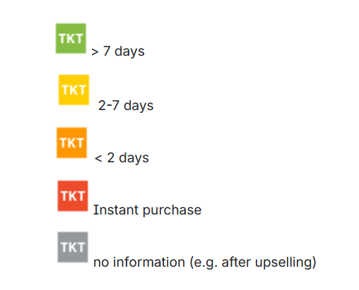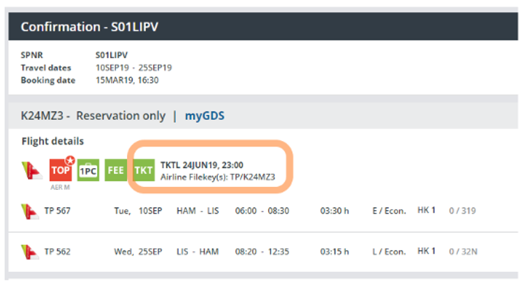 The TKTL according to GDS, converted to your time zone, is displayed here when using the mouse-over function.