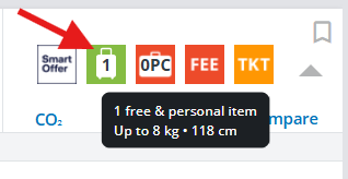 With the carry‑on baggage icon, you can see at one glance what baggage you can take on board, including size and weight by mouse-hovering over the symbol.